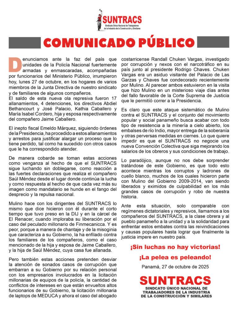 El Sindicato Nacional Unificado de Trabajadores de la Construcción y Similares (Suntracs) denunció que el 27 de octubre la Policía Nacional realizó al menos 18 allanamientos simultáneos en diferentes regiones de Panamá. La operación, organizada por el Ministerio Público y realizada con el respaldo del Ejecutivo, tuvo como objetivo a dirigentes sindicales y sus familiares, resultando en la detención de cuatro miembros de la Dirección Nacional del sindicato.